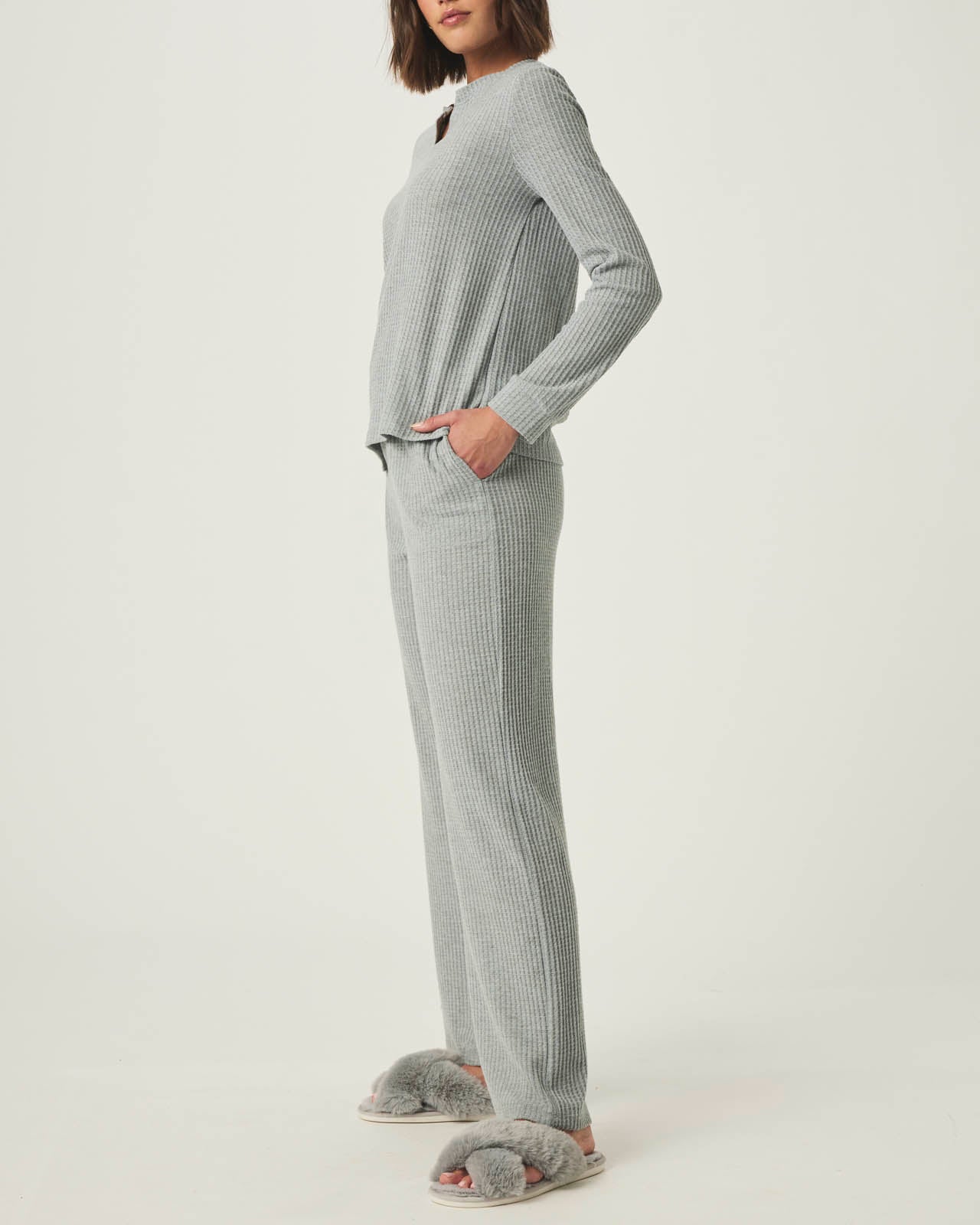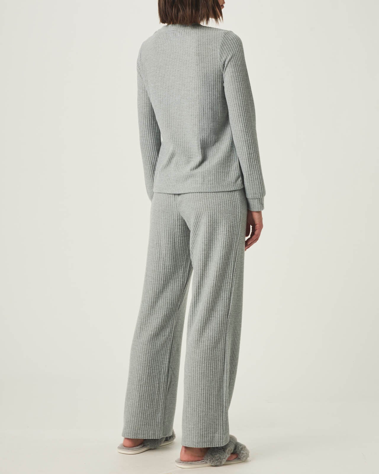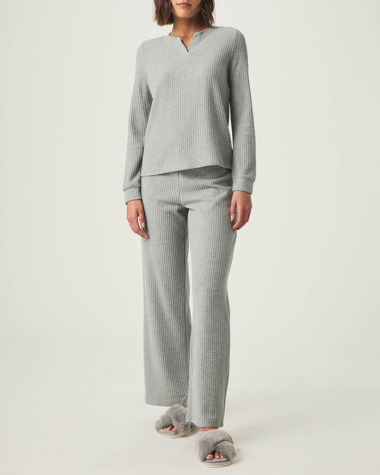 Heather Grey Split Crewneck Waffle Knit Sleep Set